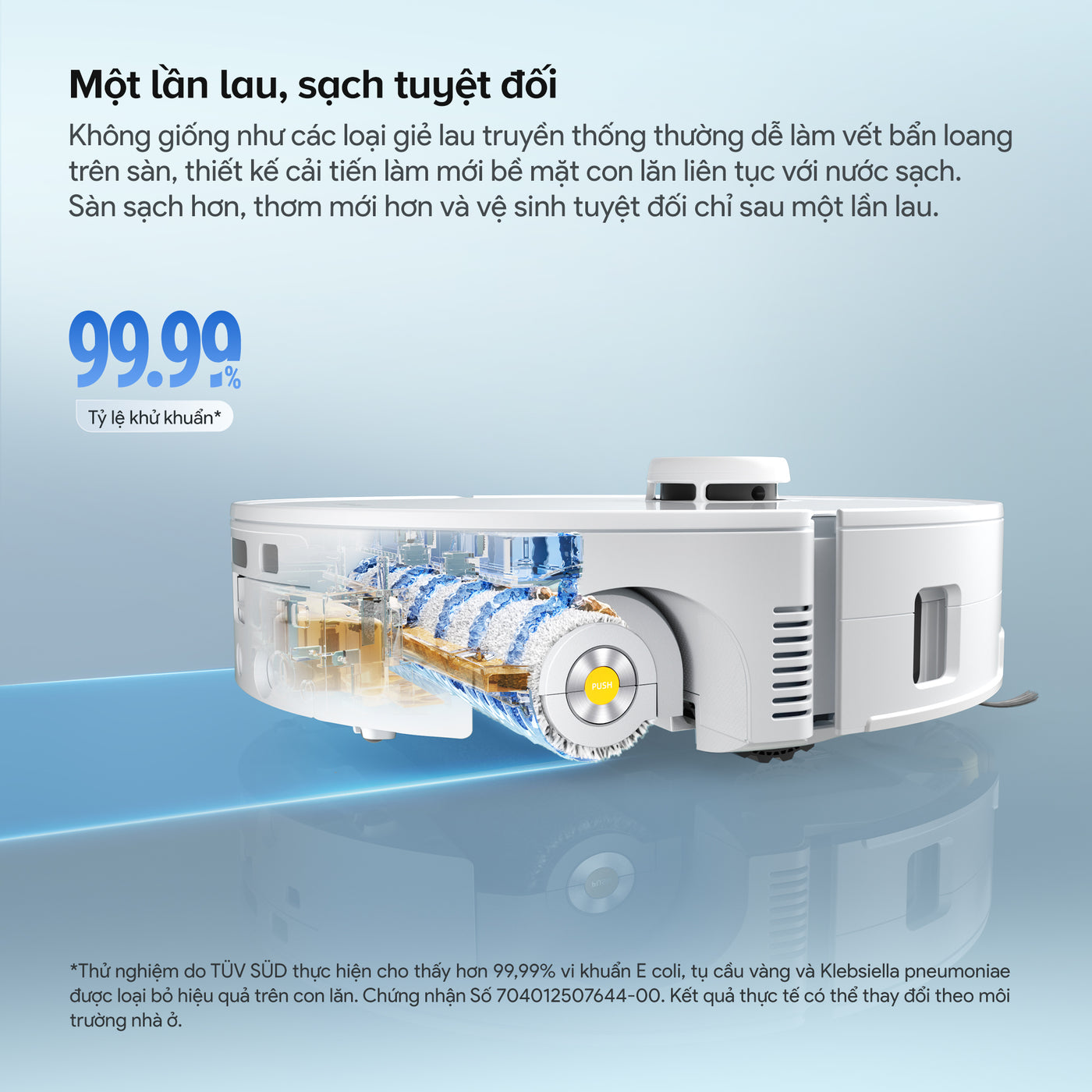 Khi gặp thảm, con lăn lập tức nâng lên để ngăn tiếp xúc trực tiếp, trong khi tấm chắn được kích hoạt tạo lớp ngăn cách vật lý, chống ẩm và chống bẩn. Công nghệ làm sạch chuyên sâu giúp tiếp cận đến tận thớ vải, loại bỏ bụi bẩn ẩn sâu mà vẫn duy trì sự khô thoáng, không gây lây bẩn chéo.