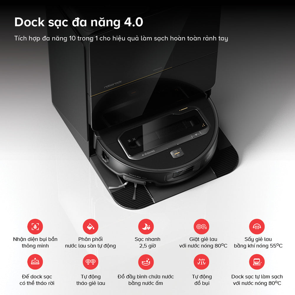 - Trạm sạc tự làm sạch với nước nóng 80°C