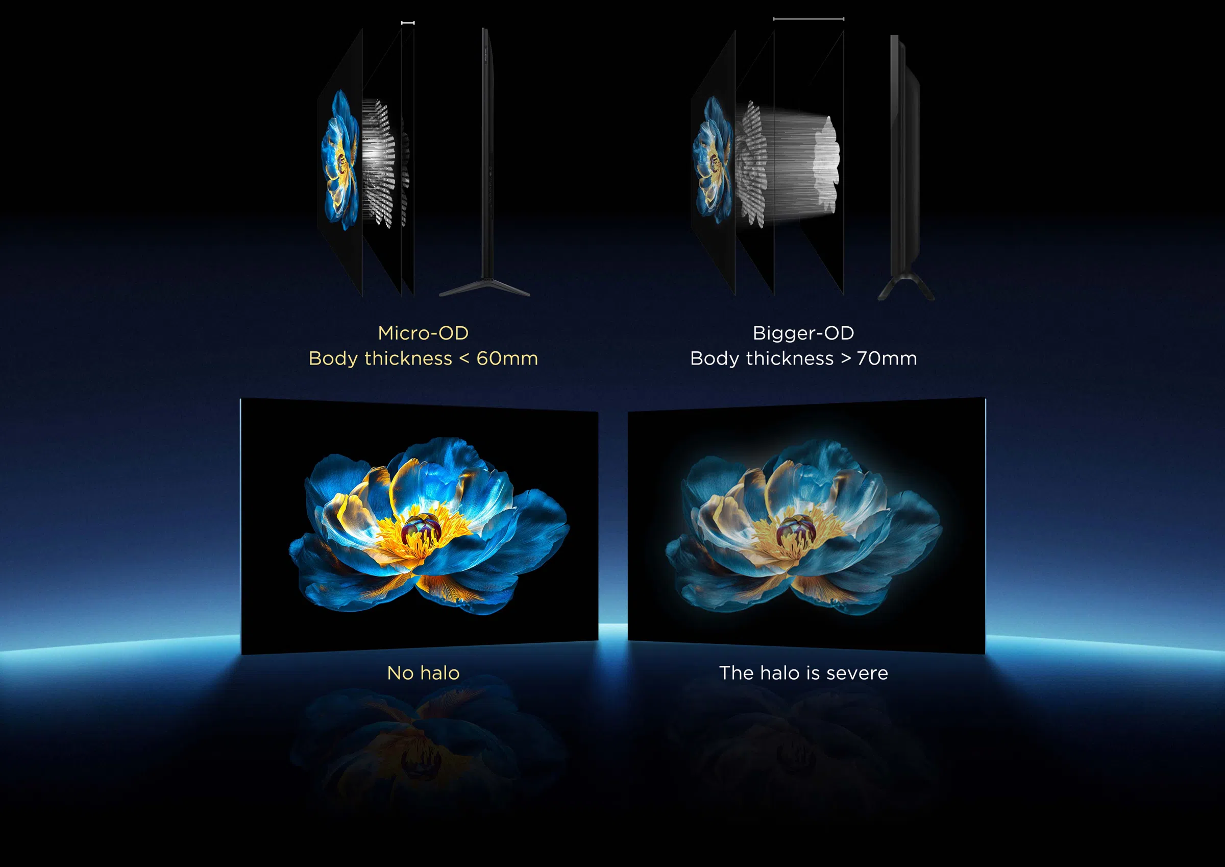Công nghệ kiểm soát quầng sáng toàn miền của TCL kiểm soát toàn bộ quá trình từ lúc tạo ra ánh sáng đến hình ảnh, tích hợp chip phát sáng hiệu suất cao và công nghệ ống kính tự phát triển, kết hợp với Micro-OD, thuật toán kiểm soát ánh sáng và bóng tối, và công nghệ Tấm nền HVA cao cấp do TCL tự sản xuất. Thông qua khả năng kiểm soát ánh sáng chính xác ở cấp độ hệ thống, công nghệ này giải quyết hiệu quả vấn đề quầng sáng và mang lại trải nghiệm xem cao cấp.