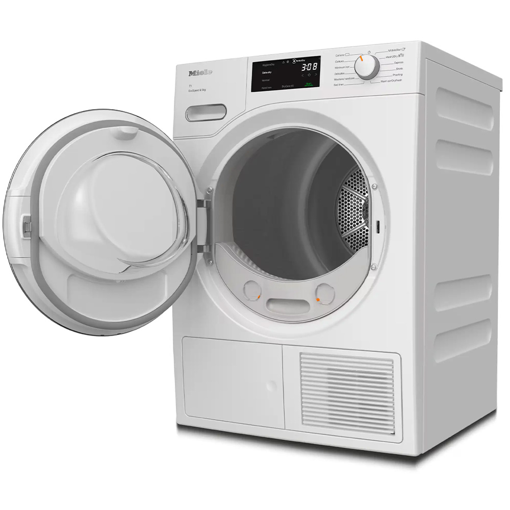 Máy sấy Miele TWH780 WP thuộc thế hệ T1 Heat Pump (Bơm nhiệt), sở hữu thiết kế độc lập (freestanding) với tông màu Lotus White trang nhã. Bảng điều khiển được thiết kế mặt phẳng, thẳng hàng, sử dụng núm xoay kết hợp với màn hình hiển thị văn bản rõ ràng, đảm bảo tính tiện dụng và bền bỉ.