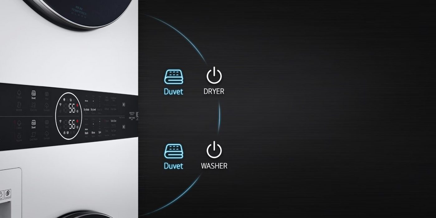 Sở hữu thiết kế kiểu cách, tiết kiệm không gian của LG WashTower™, một bộ máy sấy giặt tiện dụng.