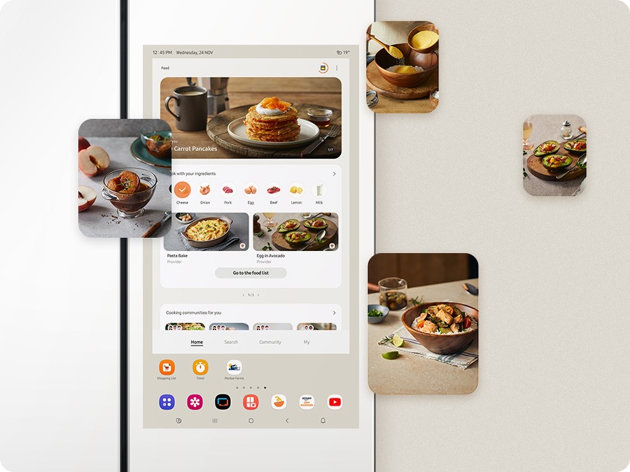 SmartThings Food* cho phép bạn tự tạo danh sách và quản lý ngày hết hạn của thực phẩm trong tủ lạnh mọi lúc, mọi nơi. Đồng thời gợi ý ngàn công thức nấu ăn theo sở thích và nguyên liệu có sẵn.