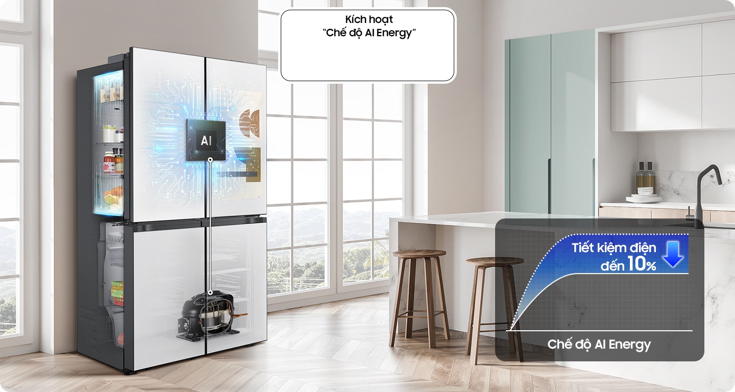 Nếu hóa đơn tiền điện dự kiến vượt quá mục tiêu đặt trước, ứng dụng SmartThings** sẽ nhắc bạn kích hoạt chế độ tiết kiệm điện AI Energy***. Từ đó, tủ lạnh sẽ tối ưu tốc độ máy nén và chu kỳ rã đông dựa trên thói quen sử dụng và môi trường xung quanh, giúp giảm điện năng tiêu thụ đến 10%*.