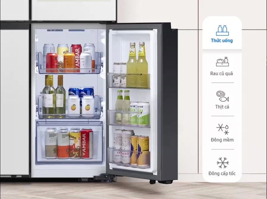 Với 5 chế độ lưu trữ linh hoạt giúp bạn dễ dàng chuyển đổi theo từng nhu cầu bảo quản: Chế độ “Thức uống” (4∘C), Chế độ “Rau củ quả” (2∘C), Chế độ “Thịt cá” (−1∘C), Chế độ “Đông mềm” (phù hợp lưu trữ thực phẩm dài ngày hơn chế độ Thịt & Cá) (−5∘C), Chế độ “Đông cấp tốc” (−23∼−15∘C).