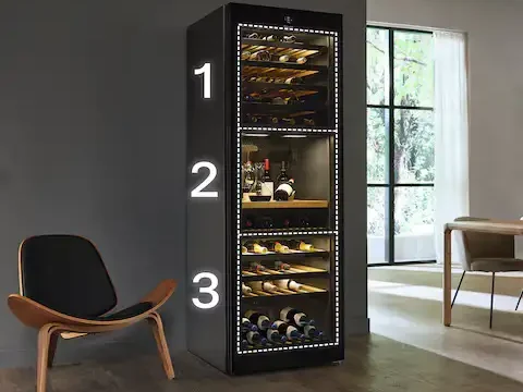 • Ba vùng nhiệt độ riêng biệt (5–20 °C) cho bảo quản tối ưu từng loại rượu vang